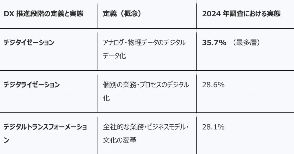 しかし、同調査における「DXに向けての取組みの進捗状況」を詳細に分析すると、その実態は「アナログで行っていた作業やデータのデジタル化(デジタイゼーション)」が35.7%で最多を占めており、DXの本丸である「ビジネスモデルや企業文化の変革(デジタルトランスフォーメーション)」の段階にある企業は依然として限定的である 。