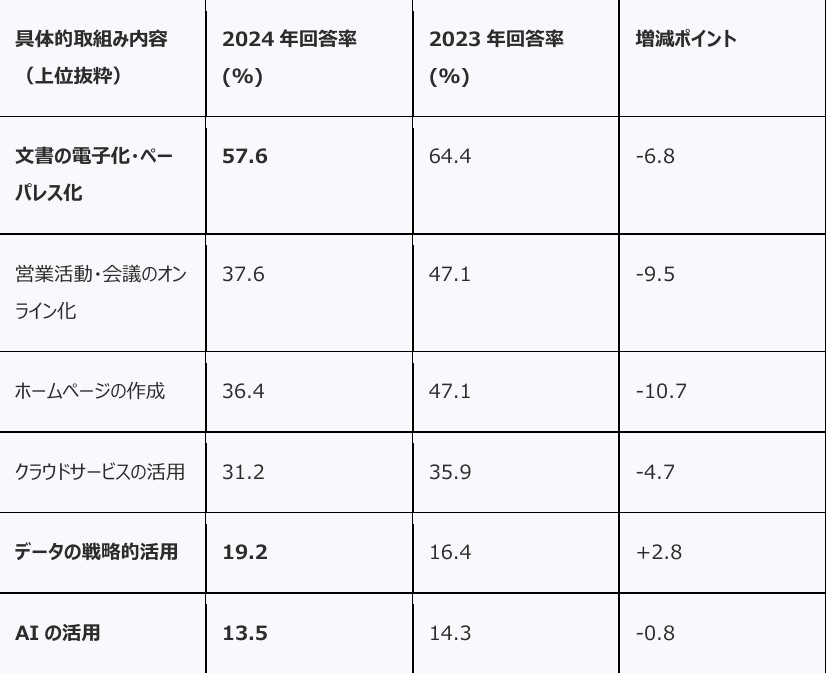 2024 年の調査データから浮かび上がる日本の中小企業のDXの実態は、以下のように要約できる。