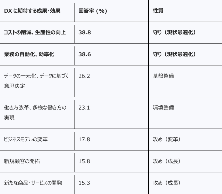 DXに期待する成果・効果についての回答分布は、日本の中小企業のマインドセットがいかに「守り」に偏重しているかを如実に示している。