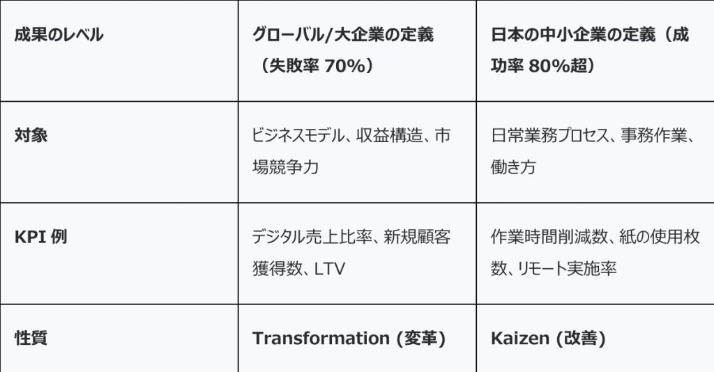 つまり、日本の中小企業は「日常業務のマイナーチェンジ(改善)」や「ツールの導入完了」そのものを「DXの成功」と定義しているのである。